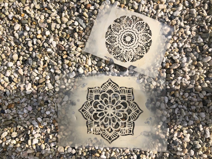 Ik wilde een bohemien vibe aan deze oosterse tafeltjes geven dus ging ik aan de slag met verf en een sjabloon. Een mandala sjabloon om precies te zijn. Ik gebruikte de CHALKY FINISH meubelverf in Antiek wit om beide tafeltjes helemaal mee te verven. De verf is super dekkend en daardoor was één laag al voldoende voor een mooi dekkend effect. Maar het sjabloon moest natuurlijk in een andere mooie kleur geverfd worden. Daarvoor koos ik voor goud!